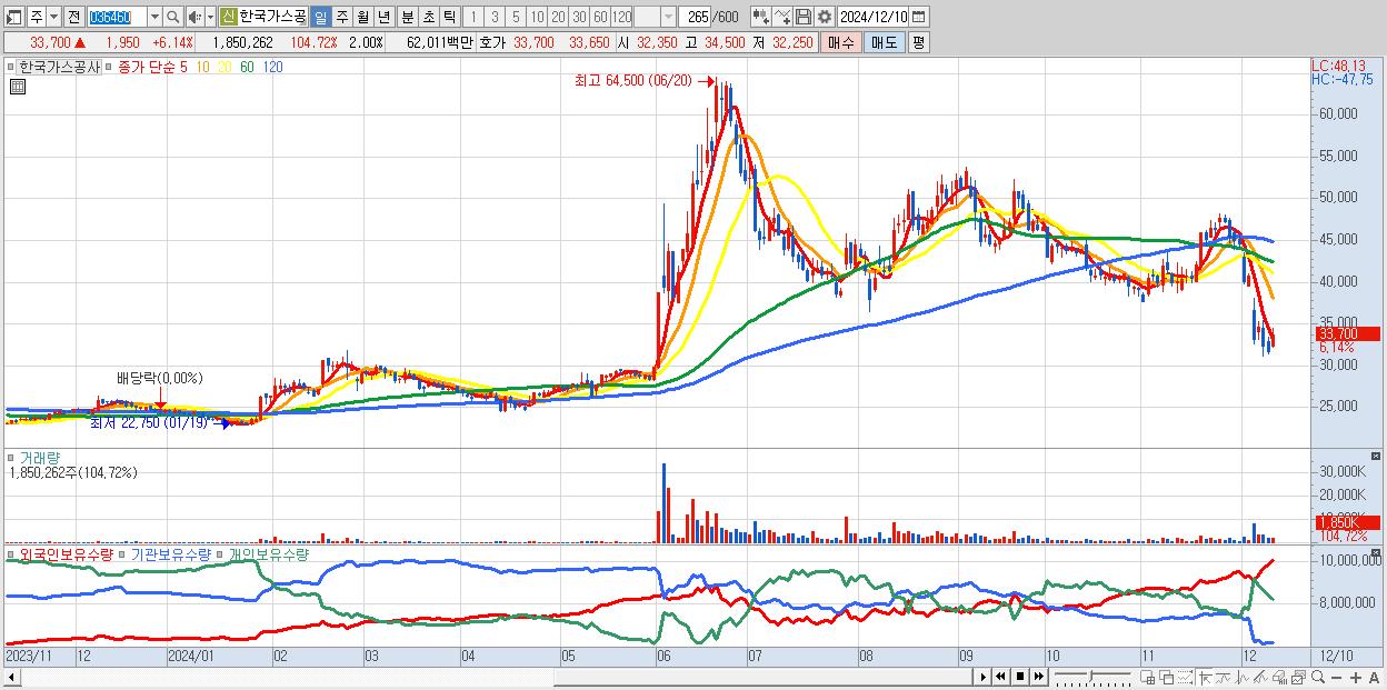 - 한국가스공사 (33,700원 ▲ 6.14% , 시총: 31,109억, 외국인 순매수 거래금:73억)
