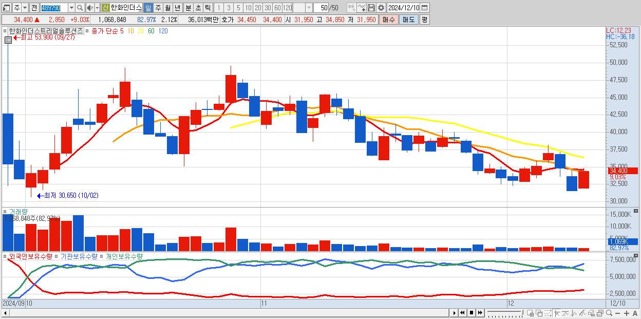 - 한화인더스트리얼솔루션즈 (34,400원 ▲ 9.03% , 시총: 17,368억, 외국인 순매수 거래금:51억)
