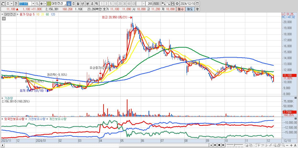 - 대한전선 (11,100원 ▲ 11% , 시총: 20,696억, 외국인 순매수 거래금:73억)