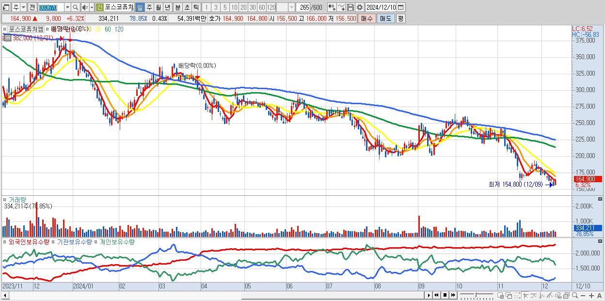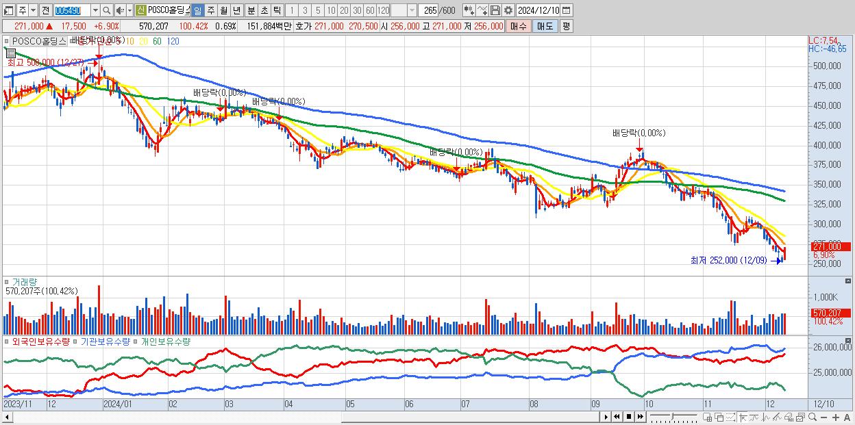 - POSCO홀딩스 (271,000원 ▲ 6.9% , 시총: 223,912억, 외국인 순매수 거래금:166억)