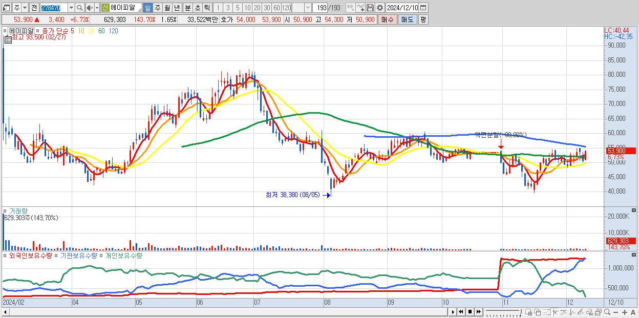 - 에이피알 (53,900원 ▲ 6.73% , 시총: 20,550억, 외국인 순매수 거래금:41억)