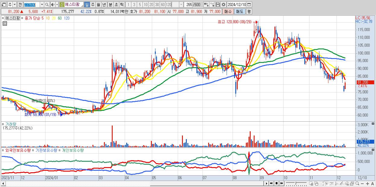 - 에스티팜 (81,200원 ▲ 7.41% , 시총: 16,347억, 외국인 순매수 거래금:41억)
