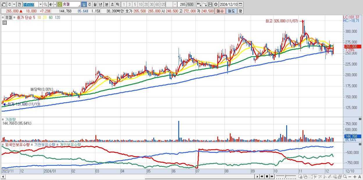 - 휴젤 (265,000원 ▲ 7.29% , 시총: 33,401억, 외국인 순매수 거래금:86억)