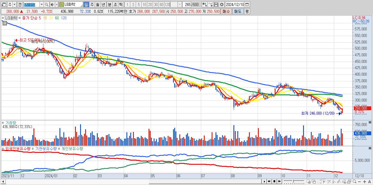 - LG화학 (268,000원 ▲ 8.72% , 시총: 189,187억, 외국인 순매수 거래금:162억)