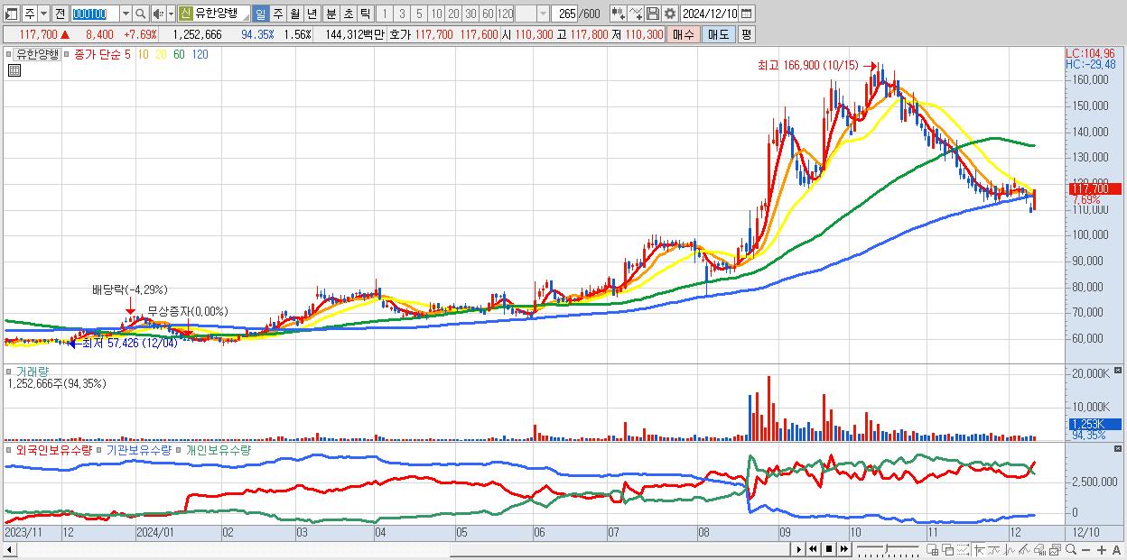 1.유한양행 117,700원 ▲ 7.69% (KOSPI, 000100)
