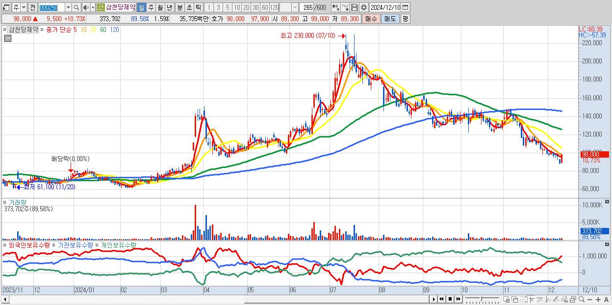 - 삼천당제약 (98,000원 ▲ 10.73% , 시총: 22,988억, 외국인 순매수 거래금:43억)