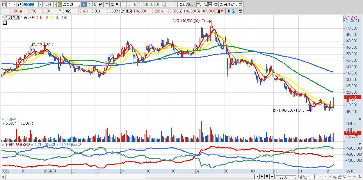 - 삼성전기 (116,300원 ▲ 10.13% , 시총: 86,869억, 외국인 순매수 거래금:89억)