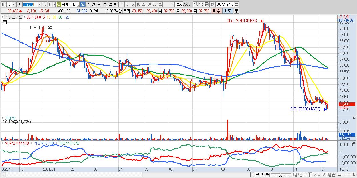 - 씨에스윈드 (39,400원 ▲ 5.63% , 시총: 16,616억, 외국인 순매수 거래금:48억)