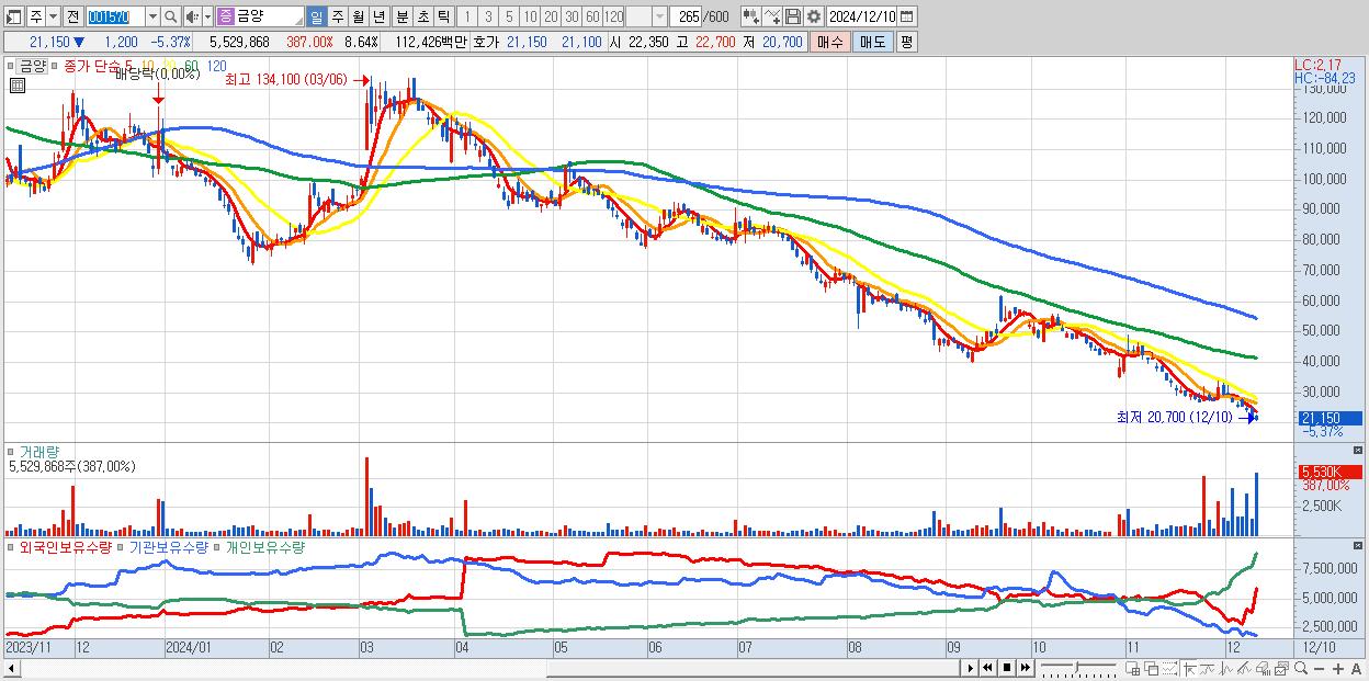 - 금양 (21,150원 ▼ -5.37% , 시총: 13,529억, 외국인 순매수 거래금:219억)
