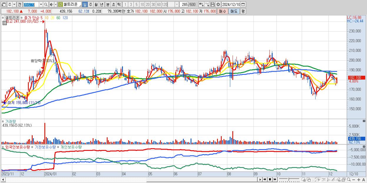 - 셀트리온 (182,100원 ▲ 4% , 시총: 395,300억, 외국인 순매수 거래금:153억)