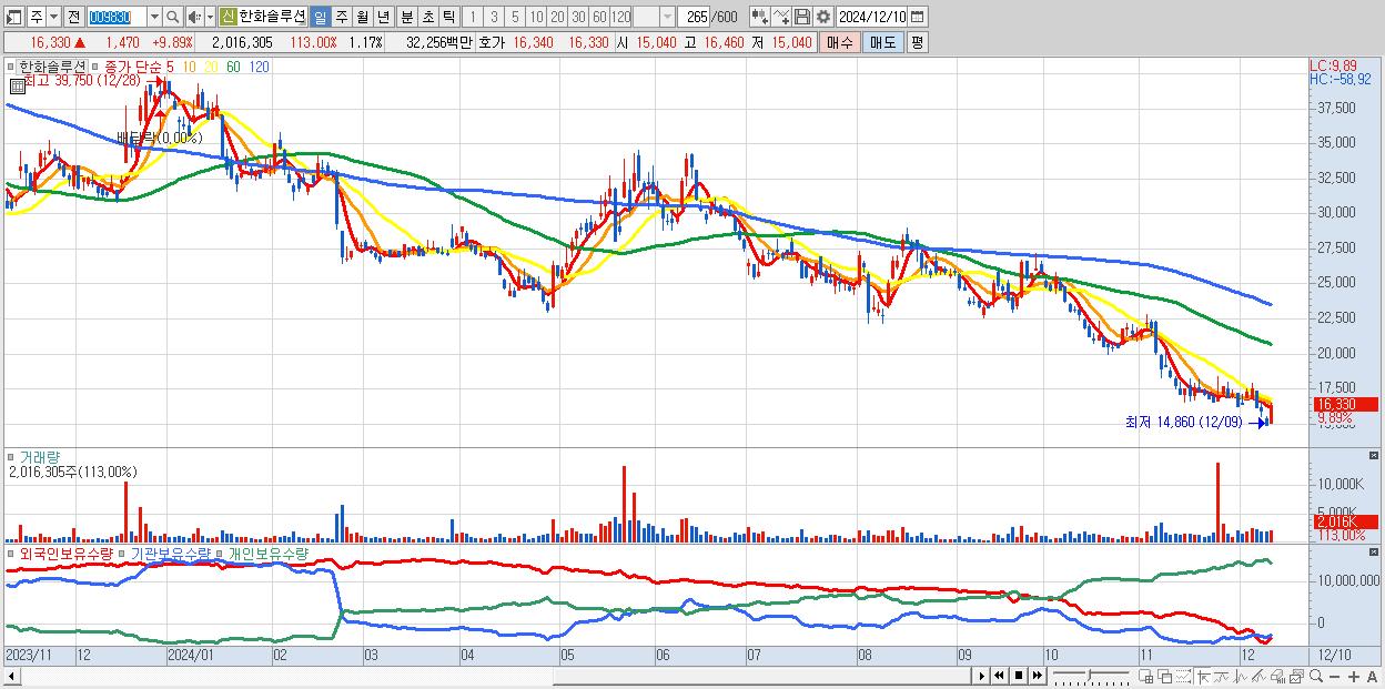 - 한화솔루션 (16,330원 ▲ 9.89% , 시총: 28,070억, 외국인 순매수 거래금:103억)