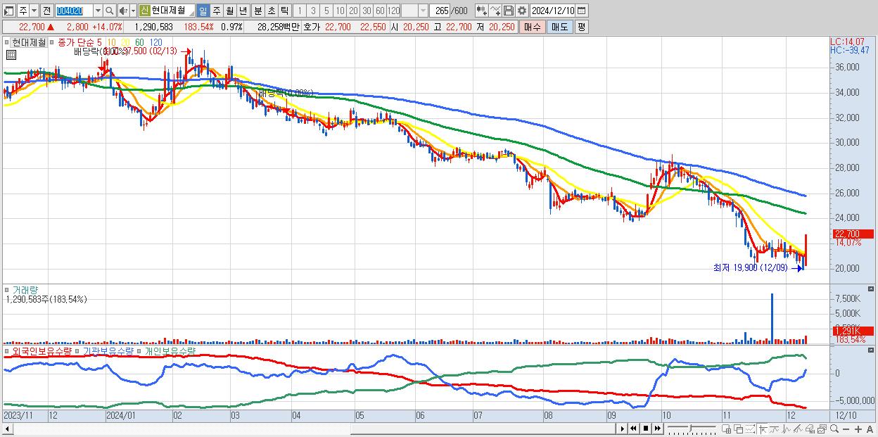 - 현대제철 (22,700원 ▲ 14.07% , 시총: 30,292억, 외국인 순매수 거래금:97억)
