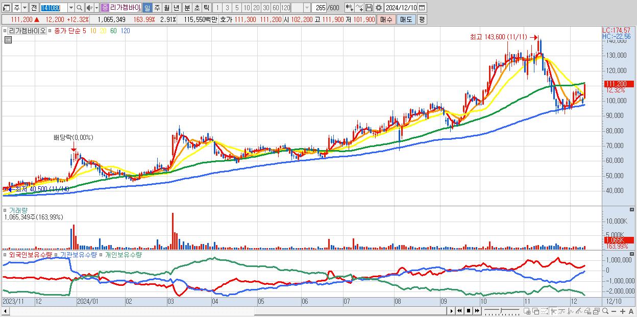 - 리가켐바이오 (111,200원 ▲ 12.32% , 시총: 40,711억, 외국인 순매수 거래금:55억)