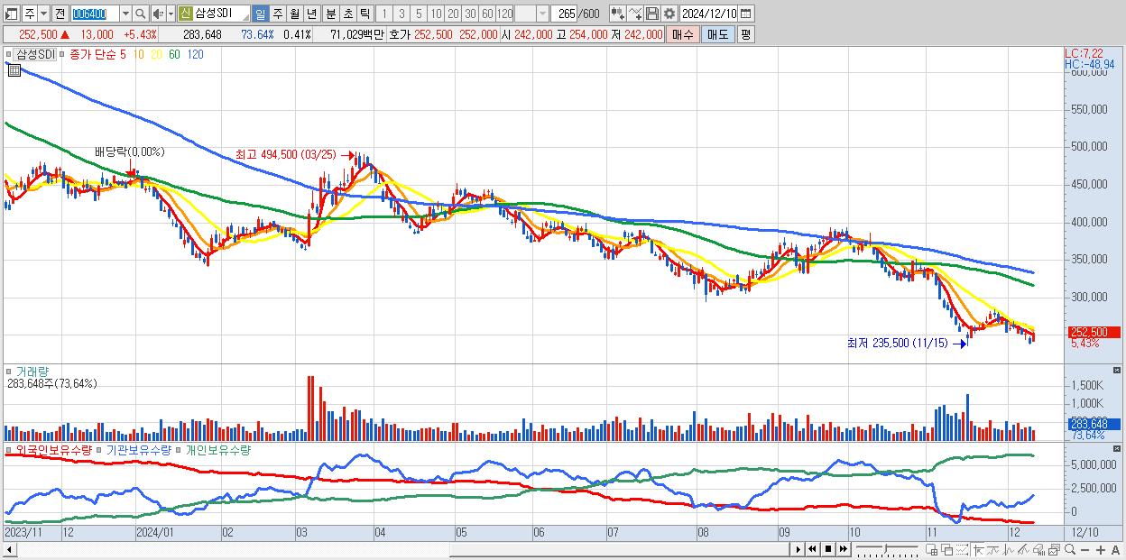 - 삼성SDI (252,500원 ▲ 5.43% , 시총: 173,630억, 외국인 순매수 거래금:105억)