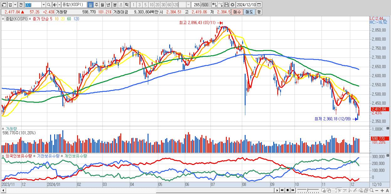 | 12/10 | 2,417.84 | ▲2.43% | -4,210억 | -1,067억 | 4,596억 | 681억 |