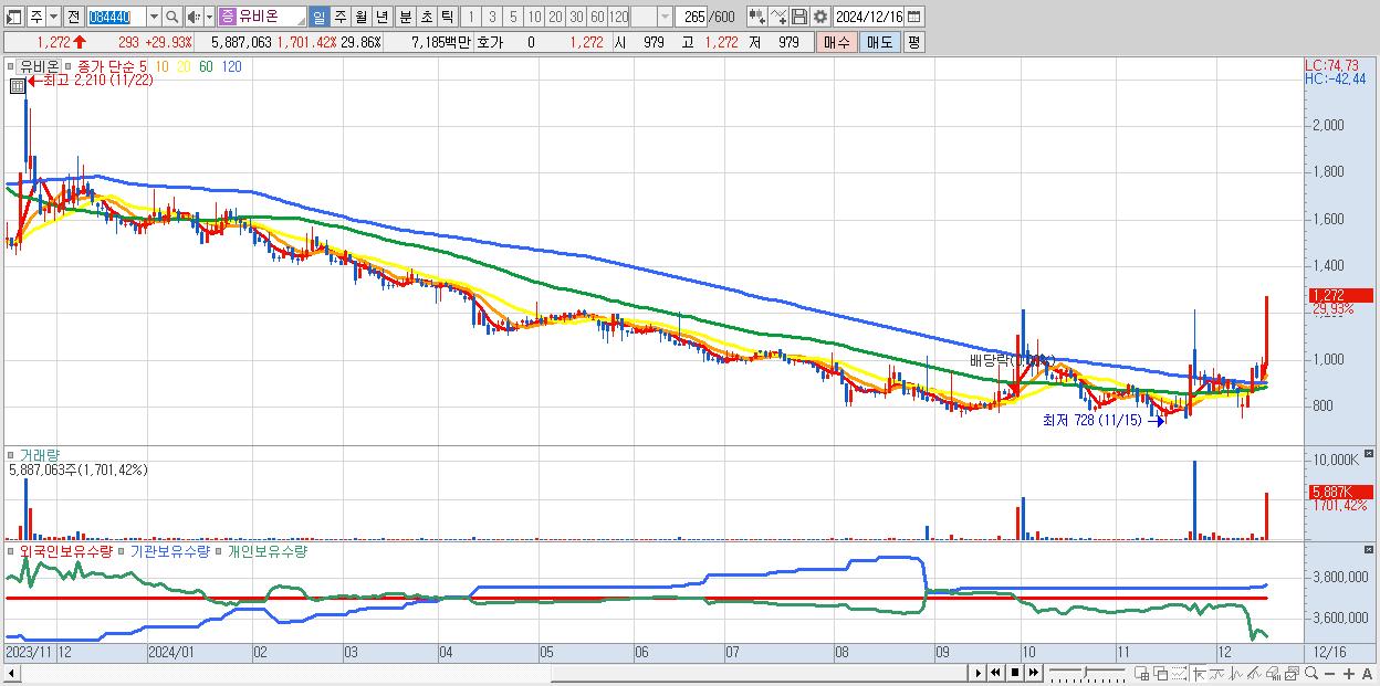 - 유비온 (1,272원 ▲ 29.93% , 시총: 251억, 거래량: 5,887,063, 거래대금:72억)