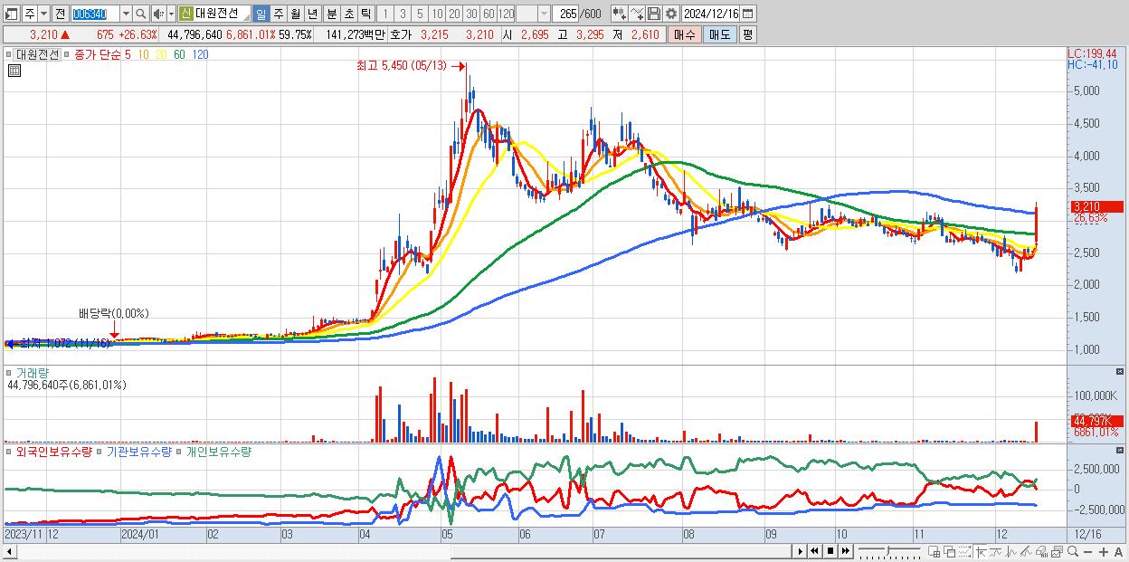 - 대원전선 (3,210원 ▲ 26.63% , 시총: 2,407억, 거래량: 44,796,640, 거래대금:1,413억)