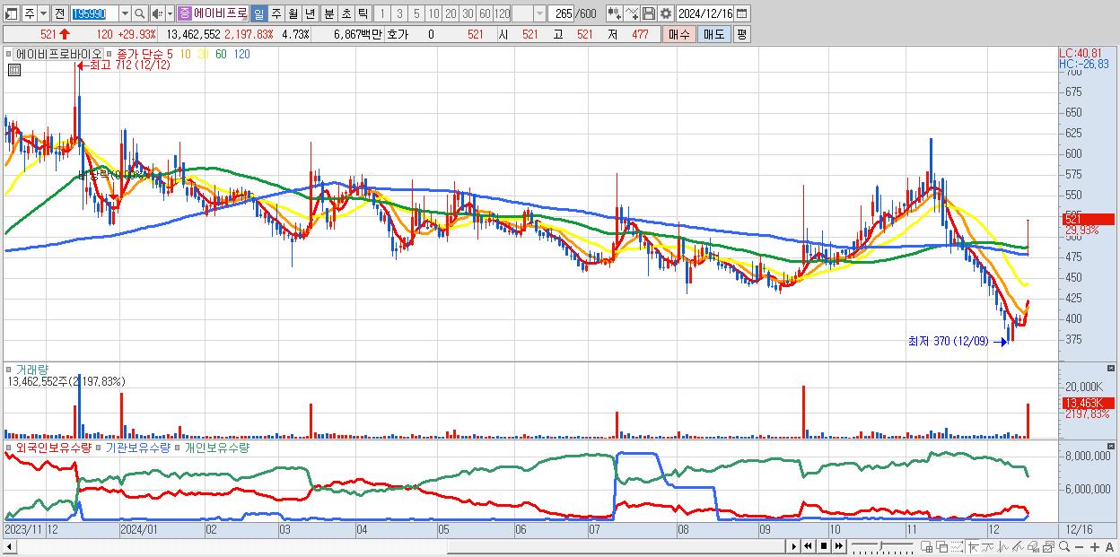 - 에이비프로바이오 (521원 ▲ 29.93% , 시총: 1,483억, 거래량: 13,462,552, 거래대금:69억)