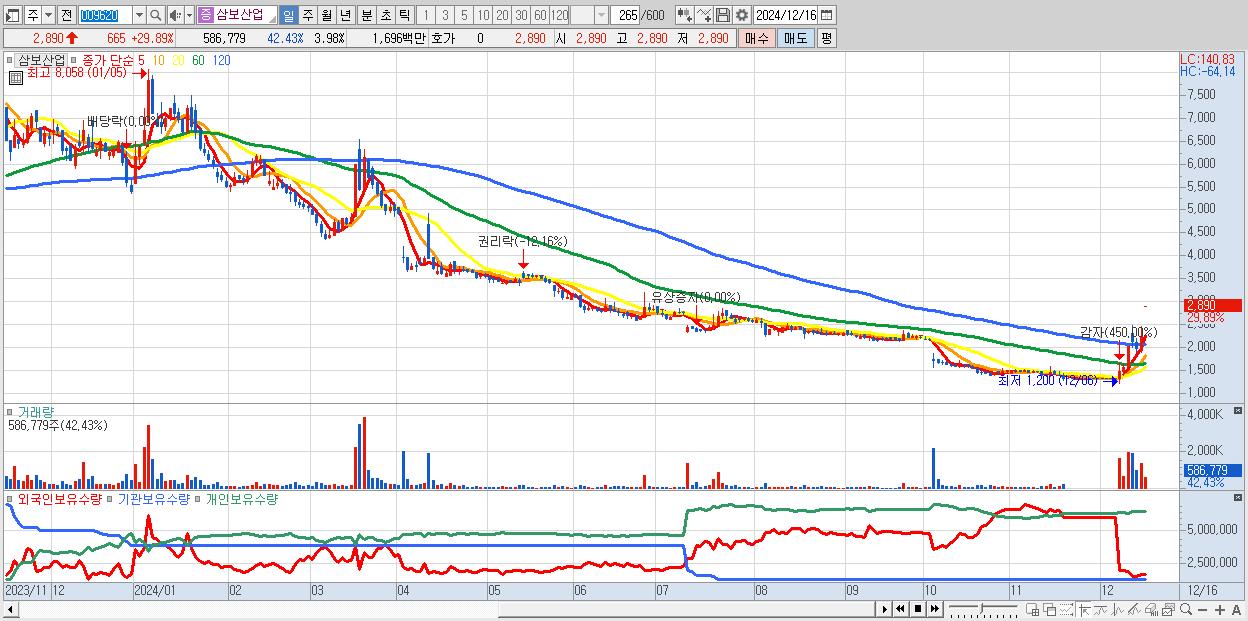 - 삼보산업 (2,890원 ▲ 29.89% , 시총: 426억, 거래량: 586,779, 거래대금:17억)