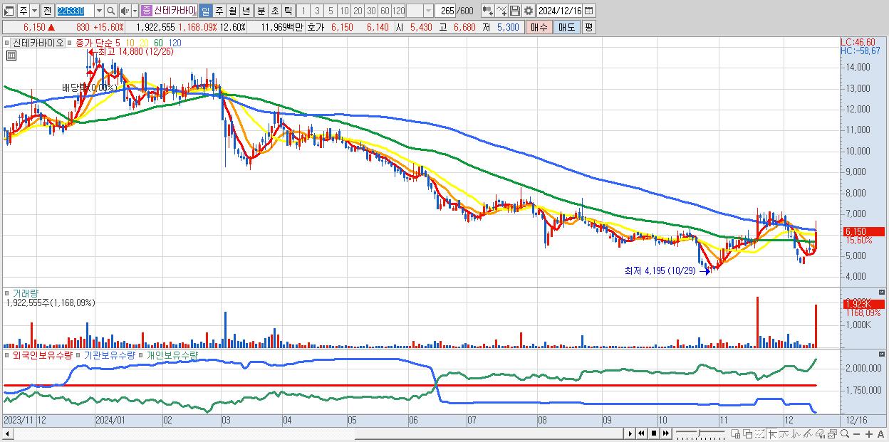 - 신테카바이오 (6,150원 ▲ 15.6% , 시총: 938억, 거래량: 1,922,555, 거래대금:120억)