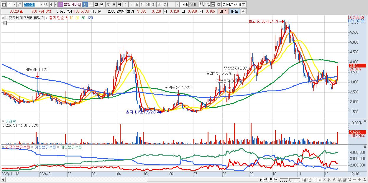 - 브릿지바이오테라퓨틱스 (3,820원 ▲ 24.84% , 시총: 1,926억, 거래량: 5,626,761, 거래대금:205억)