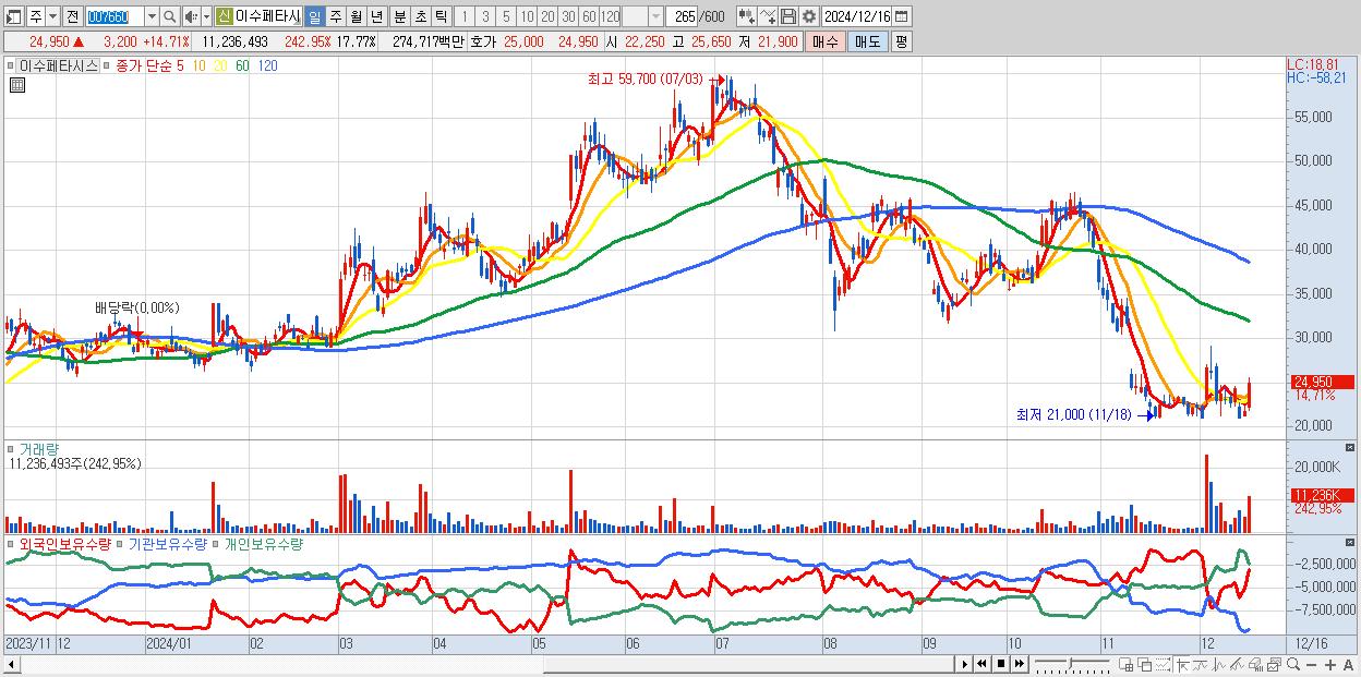 - 이수페타시스 (24,950원 ▲ 14.71% , 시총: 15,780억, 거래량: 11,236,493, 거래대금:2,747억)