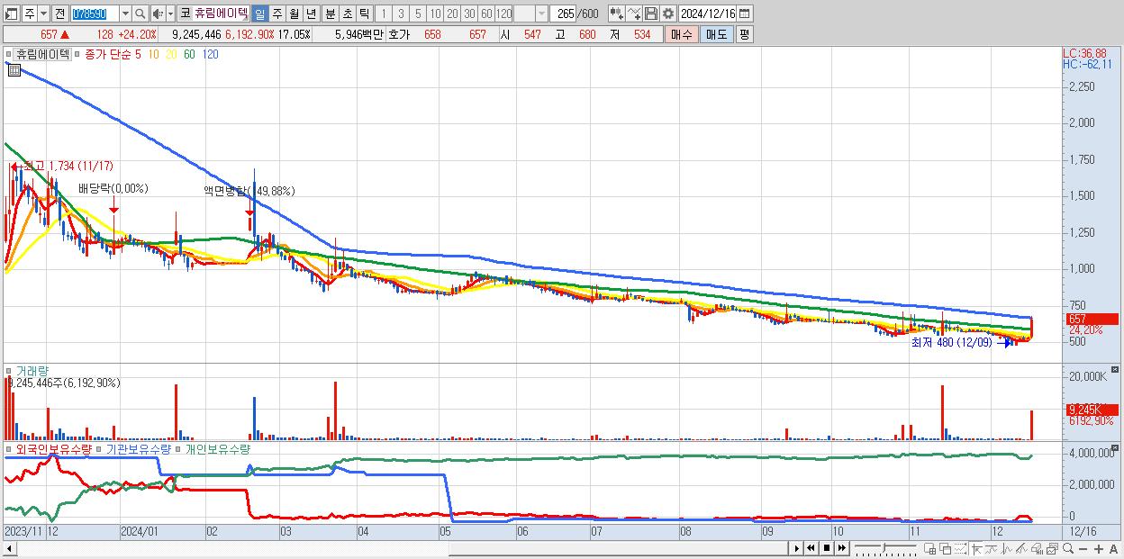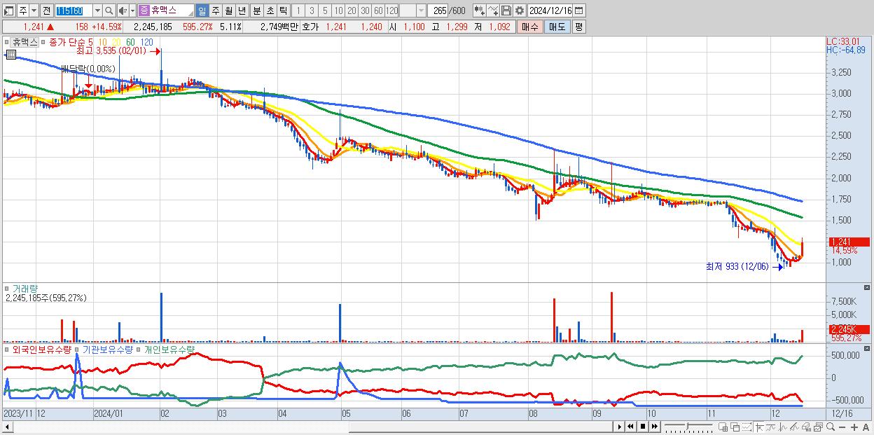 - 휴림에이텍 (657원 ▲ 24.2% , 시총: 356억, 거래량: 9,245,446, 거래대금:59억)