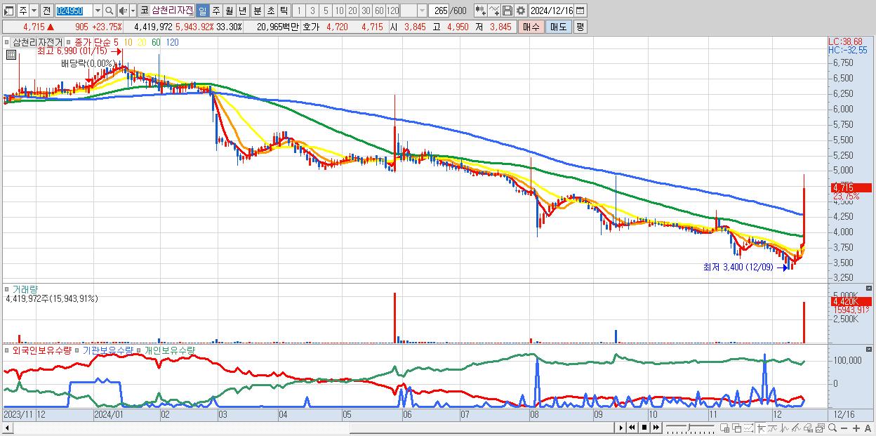 - 삼천리자전거 (4,715원 ▲ 23.75% , 시총: 626억, 거래량: 4,419,972, 거래대금:210억)