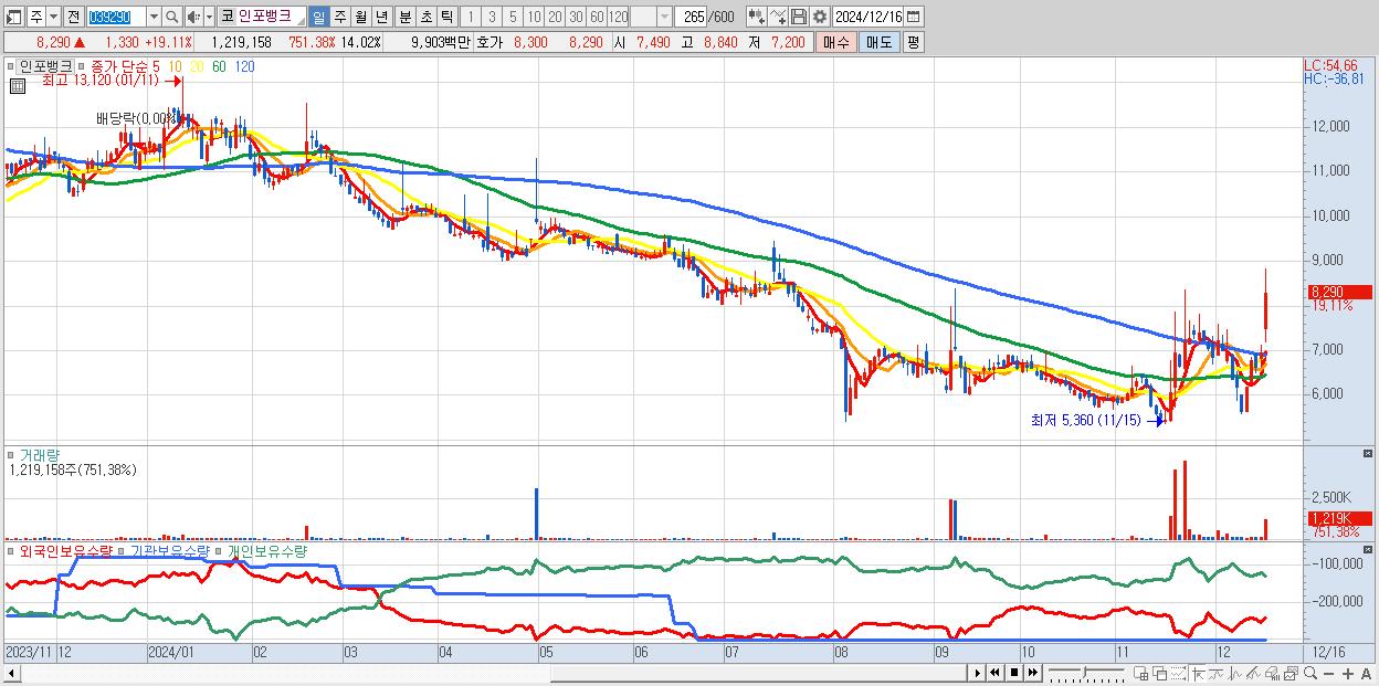 - 인포뱅크 (8,290원 ▲ 19.11% , 시총: 721억, 거래량: 1,219,158, 거래대금:99억)