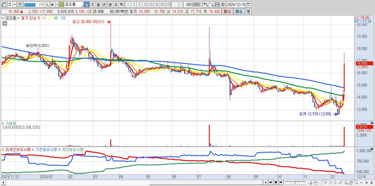 - 코오롱 (16,800원 ▲ 17.89% , 시총: 2,121억, 거래량: 3,610,615, 거래대금:607억)