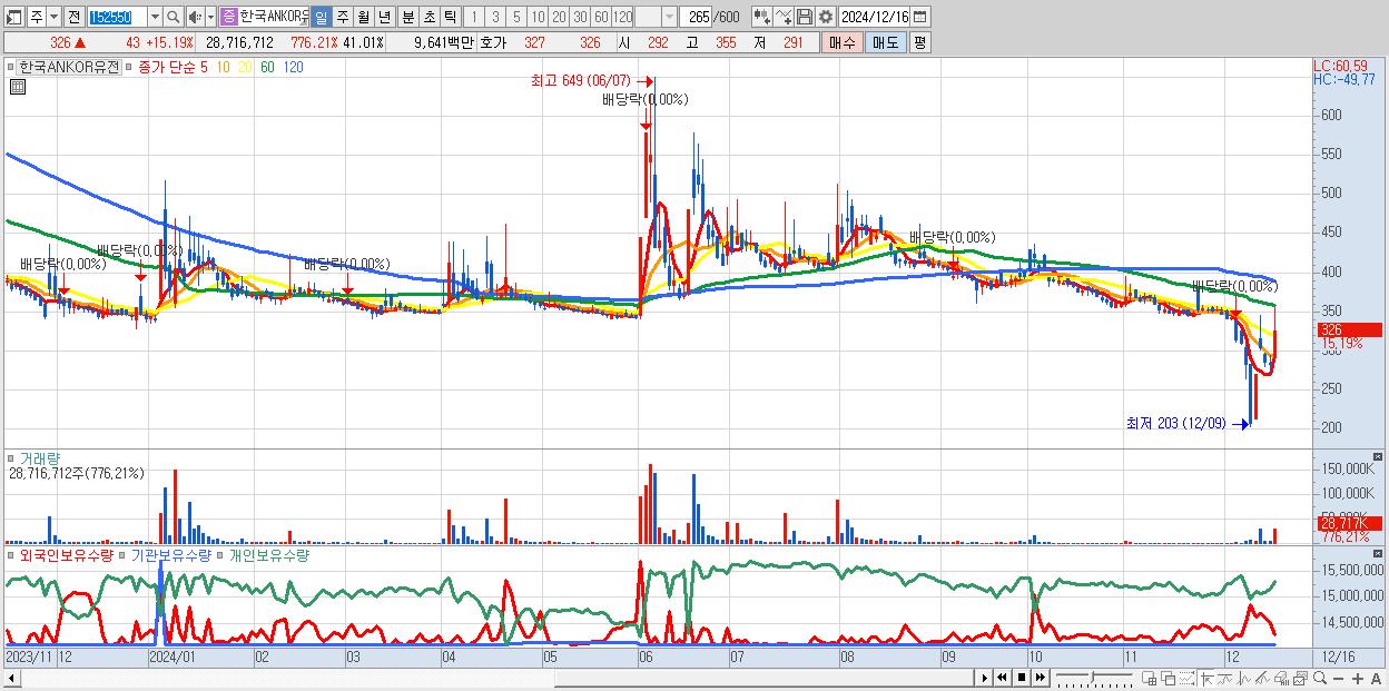 - 한국ANKOR유전 (326원 ▲ 15.19% , 시총: 228억, 거래량: 28,716,712, 거래대금:96억)