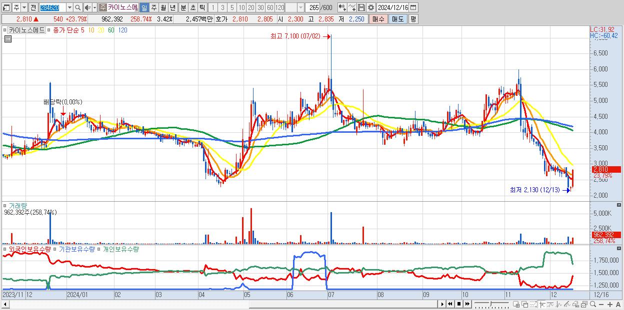 - 카이노스메드 (2,810원 ▲ 23.79% , 시총: 792억, 거래량: 962,392, 거래대금:25억)