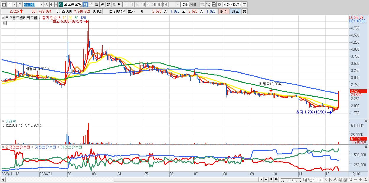 - 코오롱모빌리티그룹 (2,525원 ▲ 29.89% , 시총: 1,585억, 거래량: 5,122,001, 거래대금:122억)