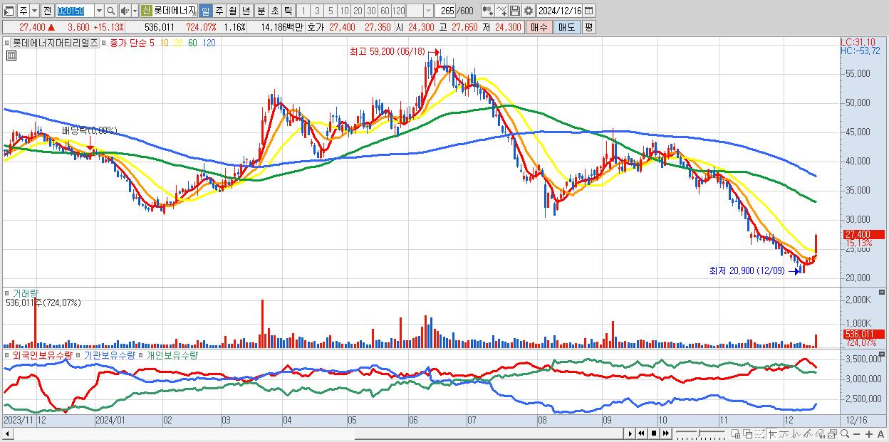 - 롯데에너지머티리얼즈 (27,400원 ▲ 15.13% , 시총: 12,634억, 거래량: 536,011, 거래대금:142억)