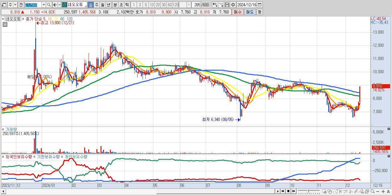 - 네오오토 (8,910원 ▲ 14.82% , 시총: 702억, 거래량: 250,597, 거래대금:21억)