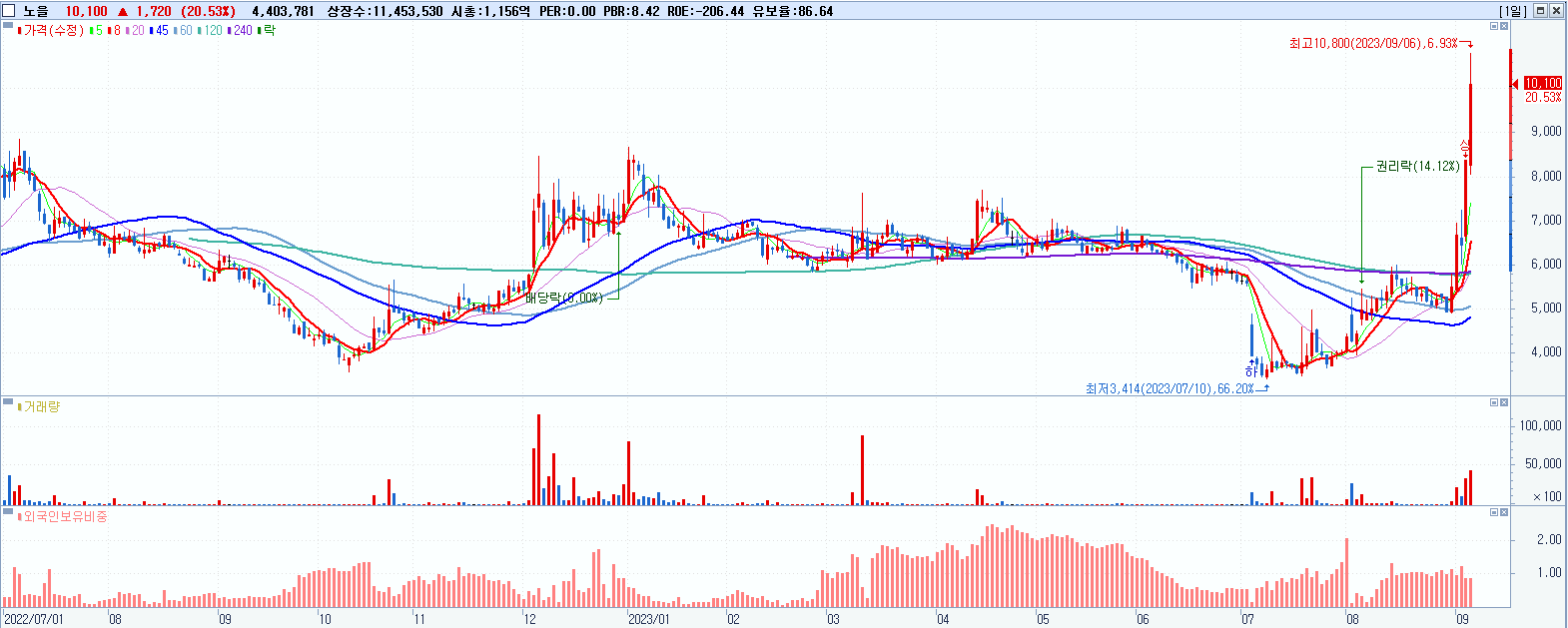 - 노을 (10,100원 ▲ 20.53% , 시총: 1,157억, 거래량: 4,417,506, 거래대금:427억, KOSDAQ)