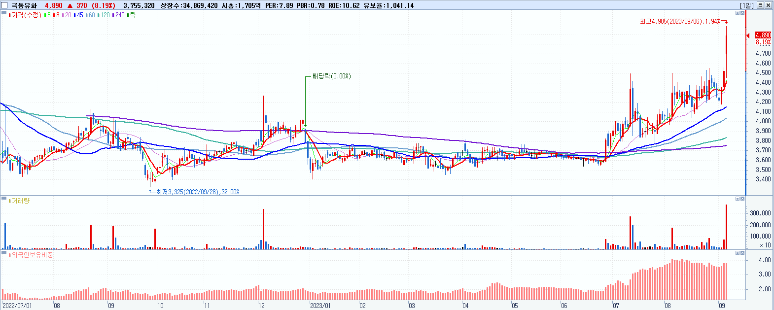 - 극동유화 (4,890원 ▲ 8.19% , 시총: 1,705억, 거래량: 3,765,635, 거래대금:179억, KOSPI)