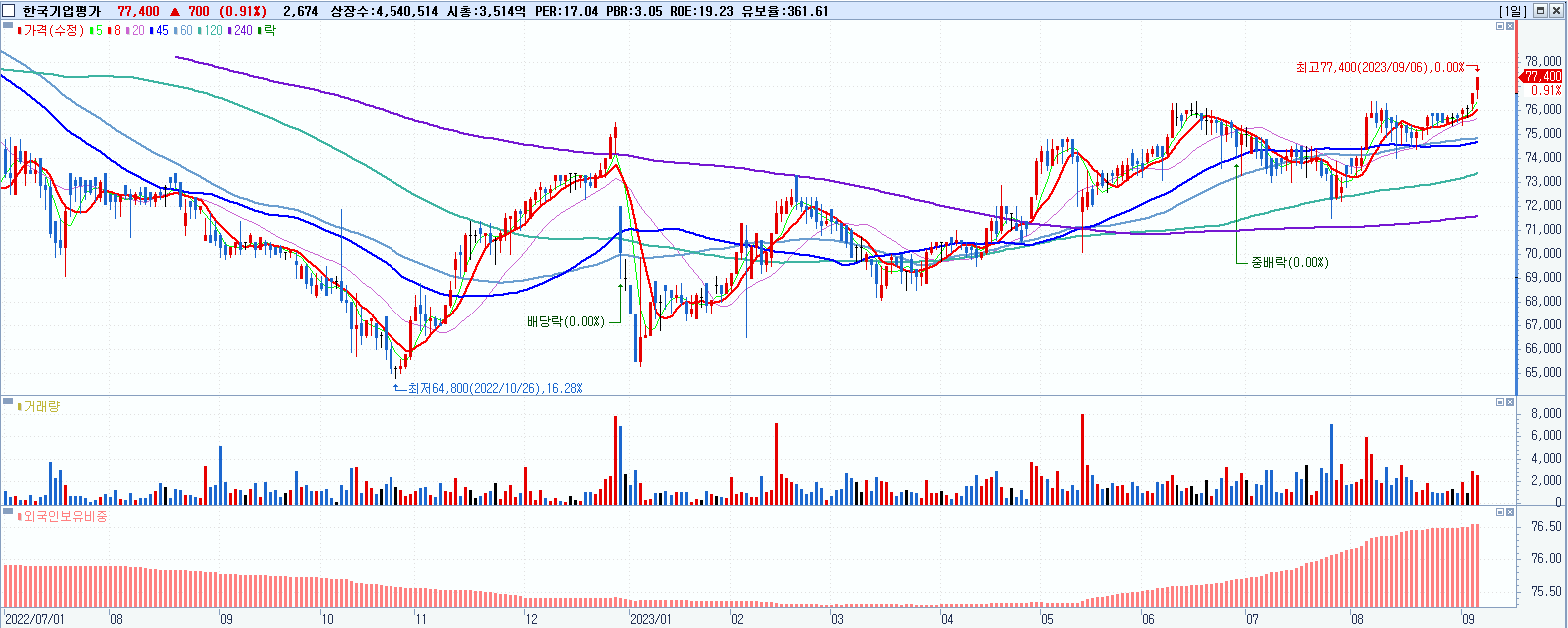 - 한국기업평가 (77,400원 ▲ 0.91% , 시총: 3,514억, 거래량: 2,686, 거래대금:2억, KOSDAQ)