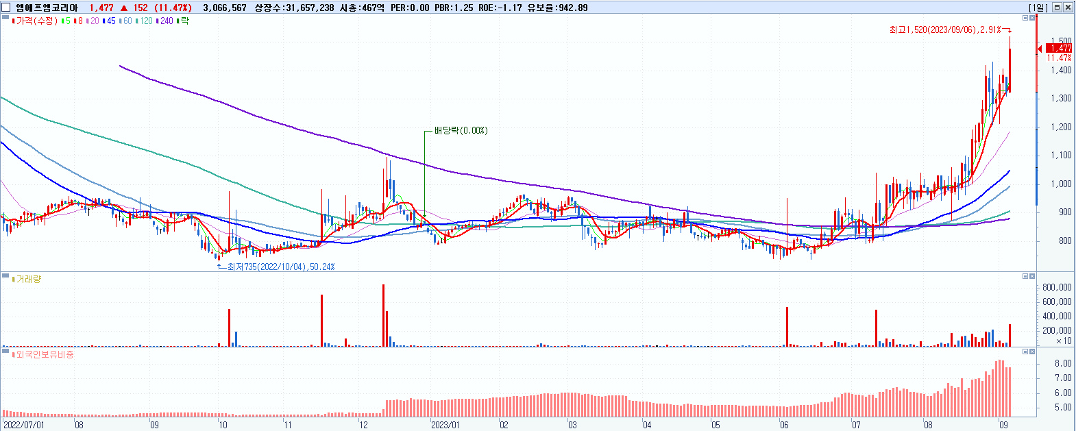 시총: 1,157억 거래량: 4,417,506 거래대금:427억