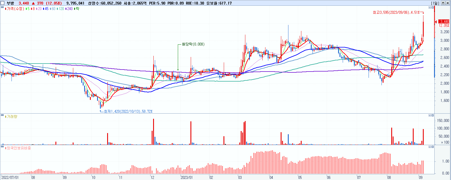 - 부방 (3,440원 ▲ 12.05% , 시총: 2,066억, 거래량: 9,843,662, 거래대금:333억, KOSDAQ)