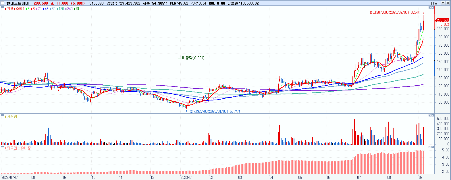 - 현대오토에버 (200,500원 ▲ 5.8% , 시총: 54,985억, 거래량: 347,539, 거래대금:693억, KOSPI)