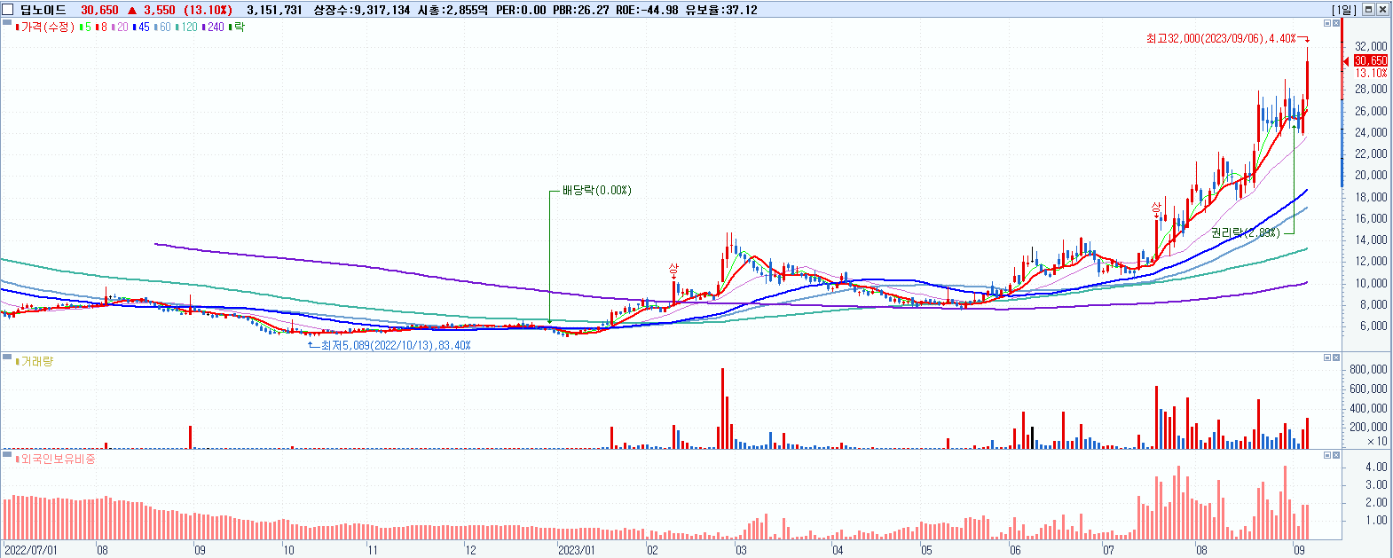 - 딥노이드 (30,650원 ▲ 13.1% , 시총: 2,856억, 거래량: 3,185,275, 거래대금:947억, KOSDAQ)
