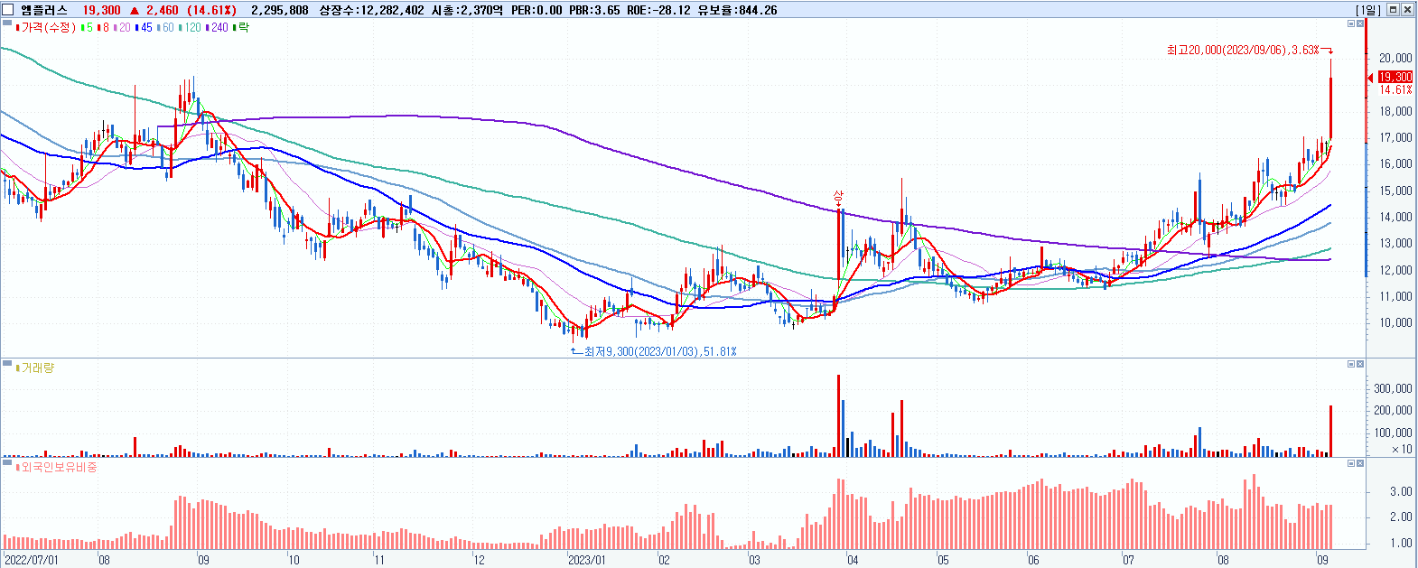 - 엠플러스 (19,300원 ▲ 14.61% , 시총: 2,371억, 거래량: 2,301,663, 거래대금:439억, KOSDAQ)