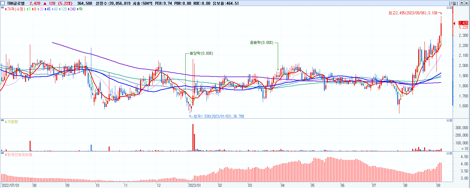 - TBH글로벌 (2,420원 ▲ 5.22% , 시총: 505억, 거래량: 365,093, 거래대금:9억, KOSPI)