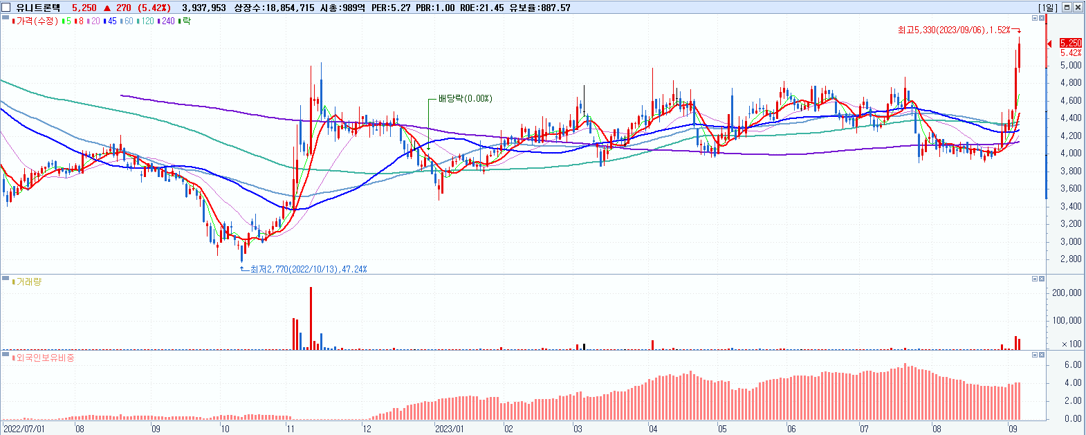 - 유니트론텍 (5,250원 ▲ 5.42% , 시총: 990억, 거래량: 3,953,078, 거래대금:204억, KOSDAQ)