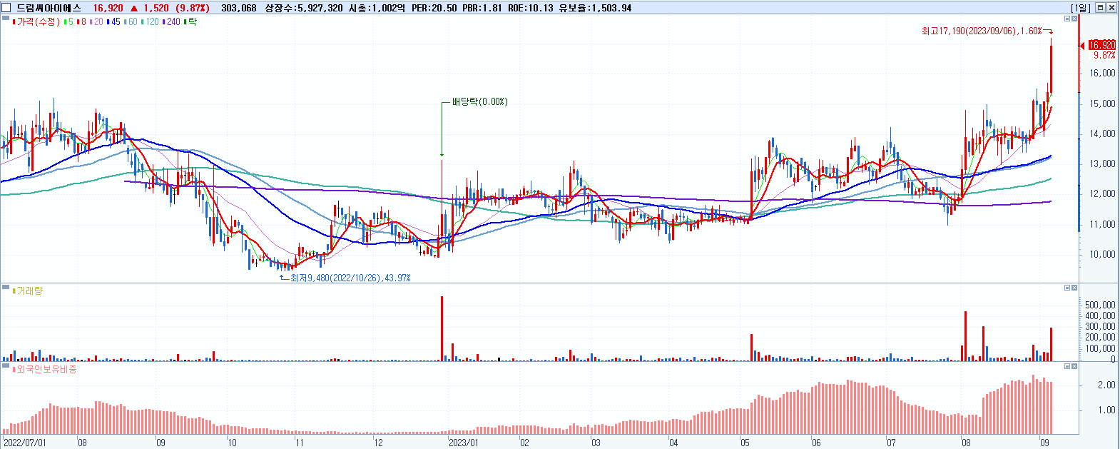 - 드림씨아이에스 (16,920원 ▲ 9.87% , 시총: 1,003억, 거래량: 303,203, 거래대금:50억, KOSDAQ)