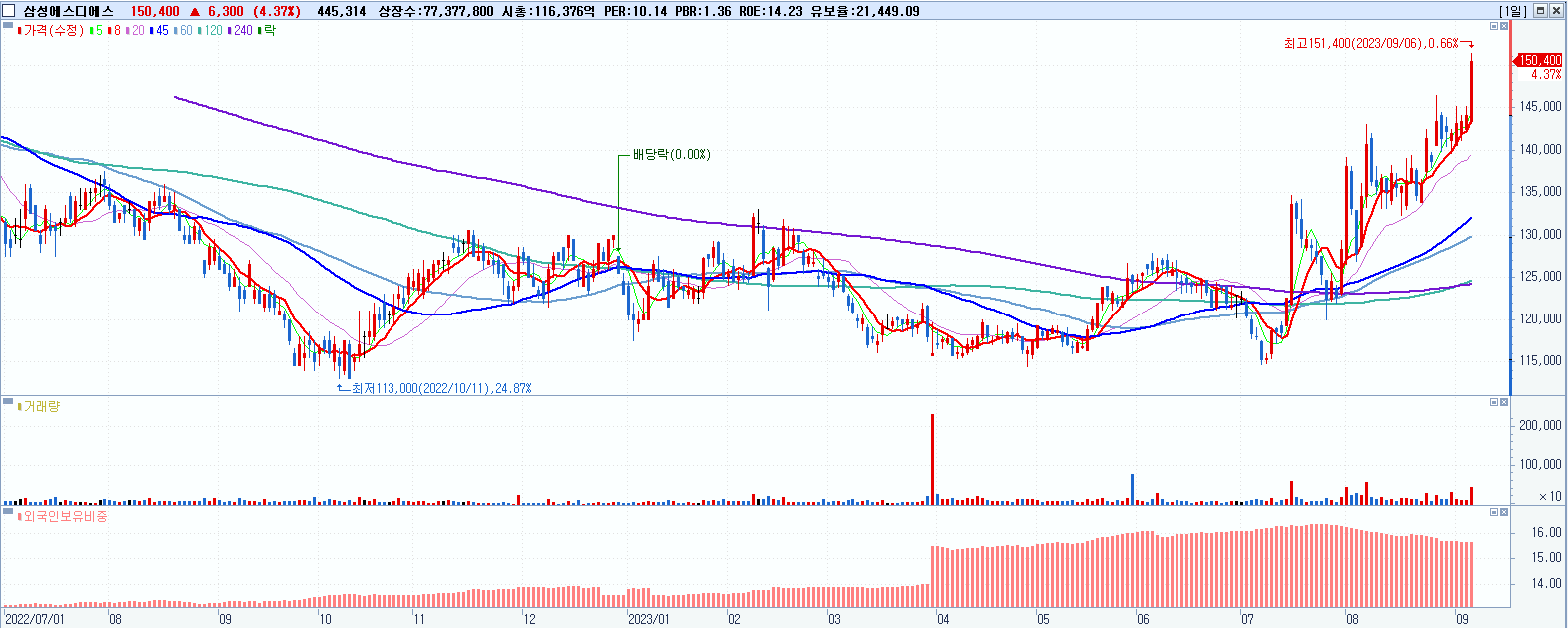 삼성에스디에스 150,400원 ▲ 4.37% (KOSPI, 018260)