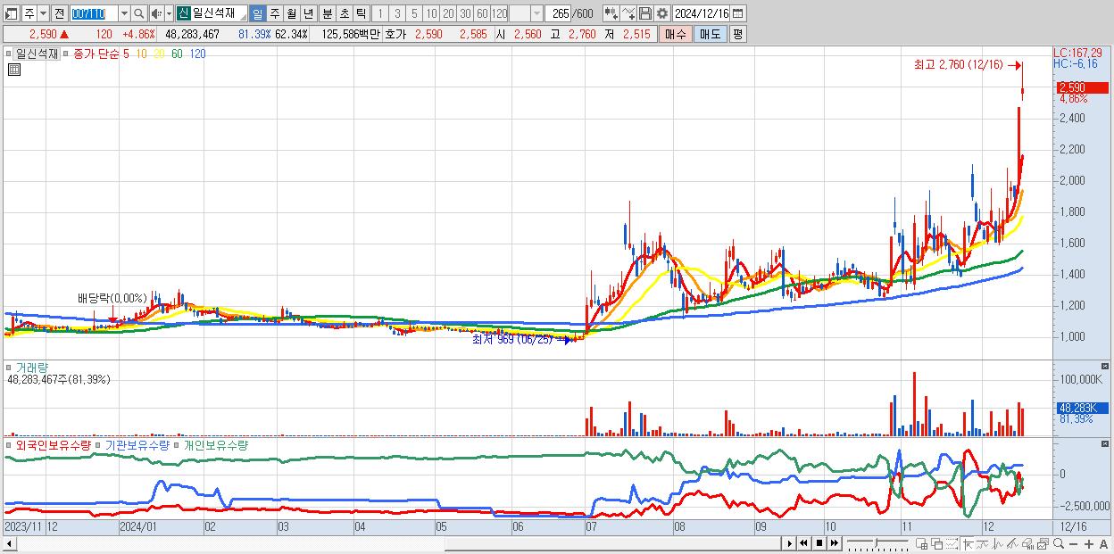 - 일신석재 (2,590원 ▲ 4.86% , 시총: 2,006억, 거래량: 48,283,467, 거래대금:1,256억, KOSPI)