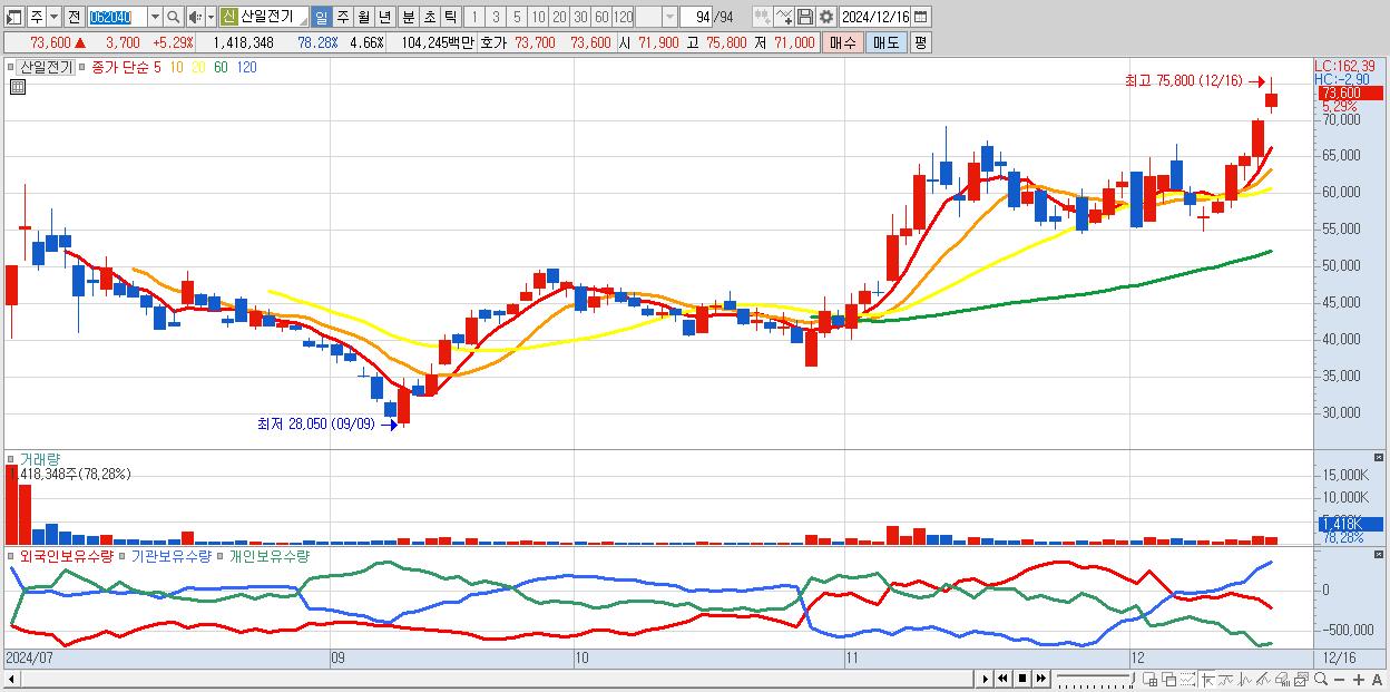 - 산일전기 (73,600원 ▲ 5.29% , 시총: 22,408억, 거래량: 1,418,348, 거래대금:1,042억, KOSPI)