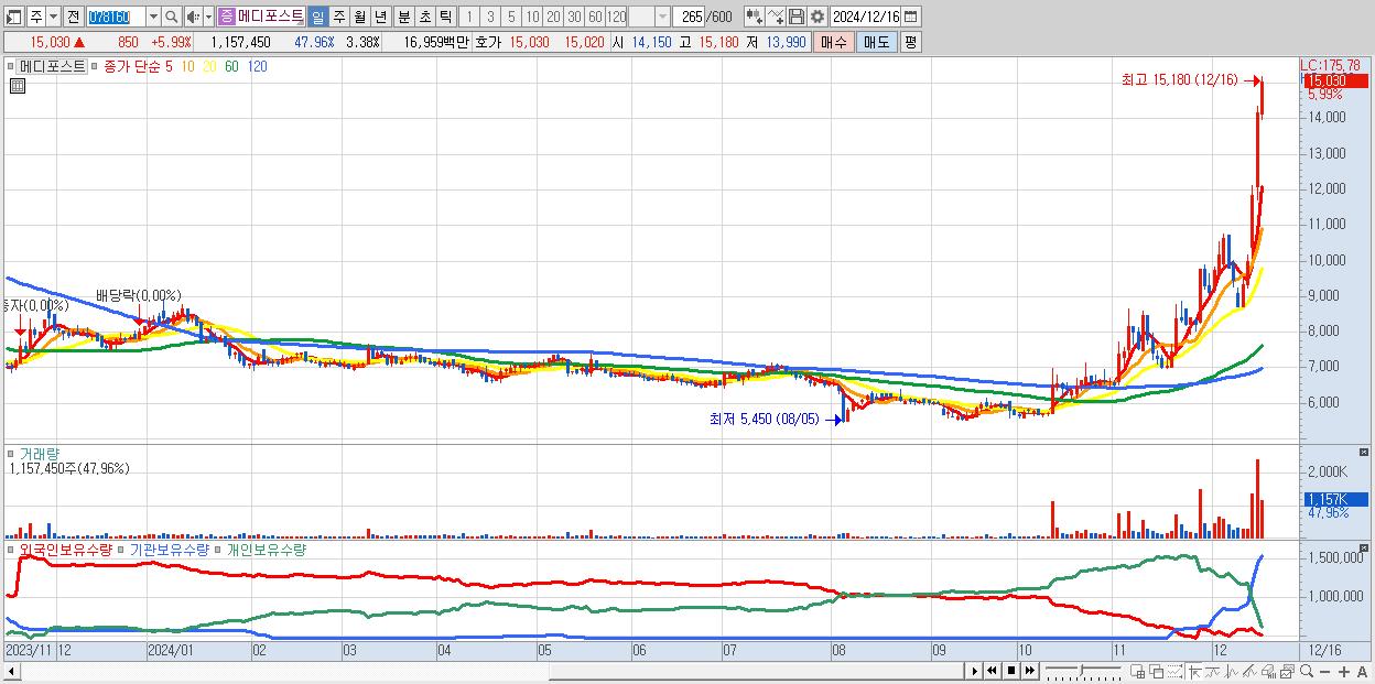 - 메디포스트 (15,030원 ▲ 5.99% , 시총: 5,143억, 거래량: 1,157,450, 거래대금:170억, KOSDAQ)